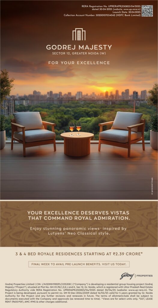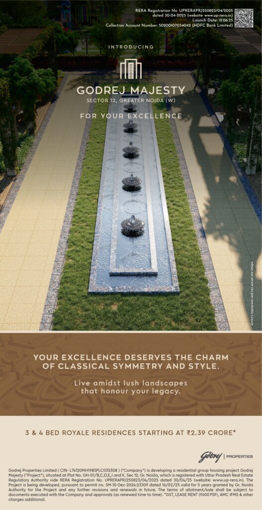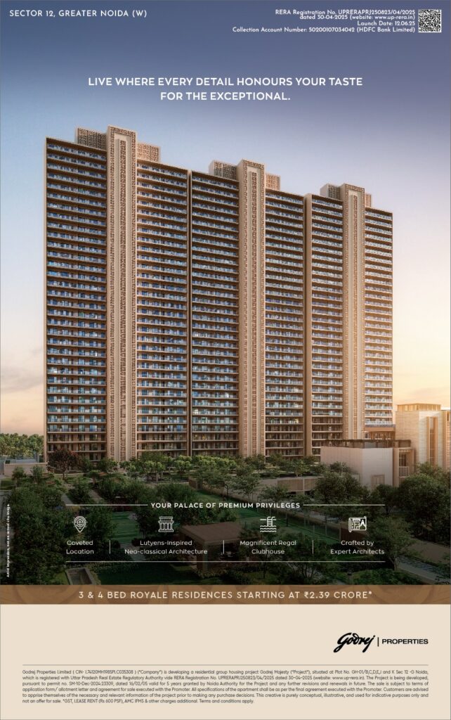 Godrej Majesty in Sector 12, Noida Extension — a grand residential address that blends modern architecture with lush greenery and unmatched connectivity. This upcoming project by Godrej Properties brings you thoughtfully planned 3 & 4 BHK luxury residences, designed for elegant living and smart lifestyles. Crafted for those who seek sophistication, comfort, and convenience in one place, Godrej Sector 12 offers the perfect setting for your dream home, surrounded by the finest infrastructure, seamless connectivity, and world-class amenities.